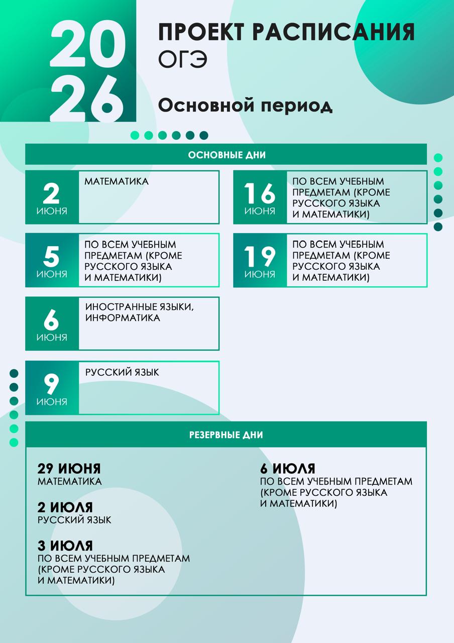 Проведение ОГЭ для выпускников 9 классов также разделено на три периода: досрочный (с 21 апреля по 18 мая 2026 года), основной (с 2 июня по 6 июля 2026 года) и дополнительный (с 3 по 25 сентября 2026 года).