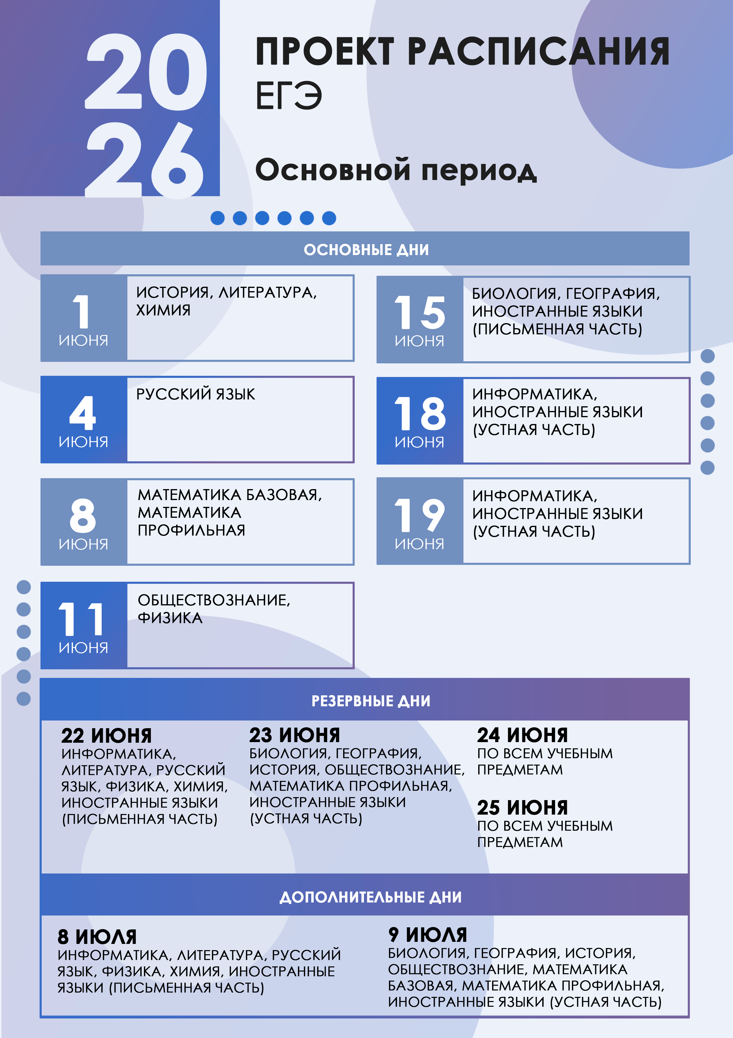 Опубликованы проекты совместных приказов Минпросвещения России и Рособрнадзора с расписанием единого государственного экзамена (ЕГЭ), основного государственного экзамена (ОГЭ) и государственного выпускного экзамена (ГВЭ) на 2026 год.